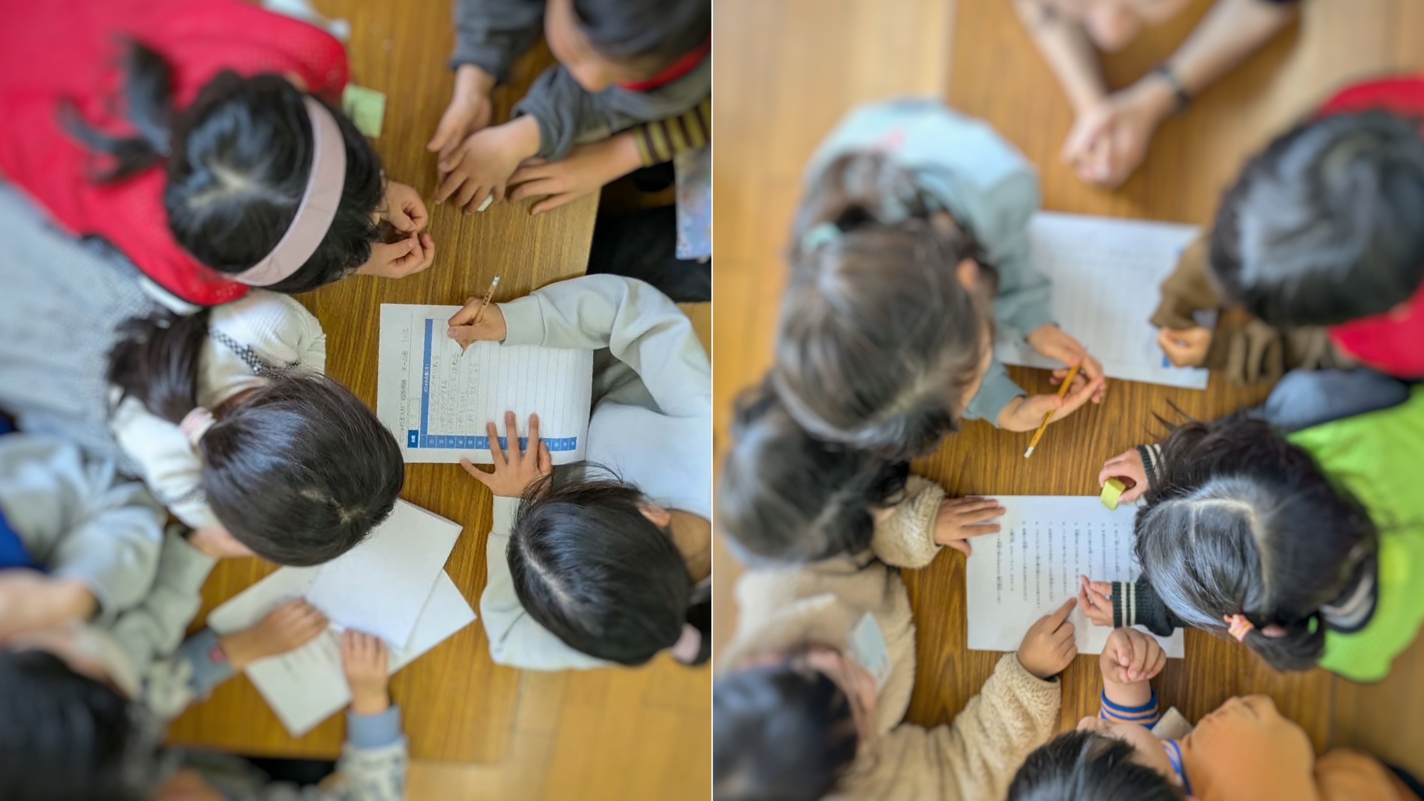 「普段、落ち着きがなく走り回っている子も言葉あそびが好きな様子で、集中して取り組んでいました。そのような子は一人だけではなく、“何人も”です。学年を混ぜて組んだグループにしたため、上級生(3年生)が説明したり、先輩の姿を見せていたのが印象的でした」