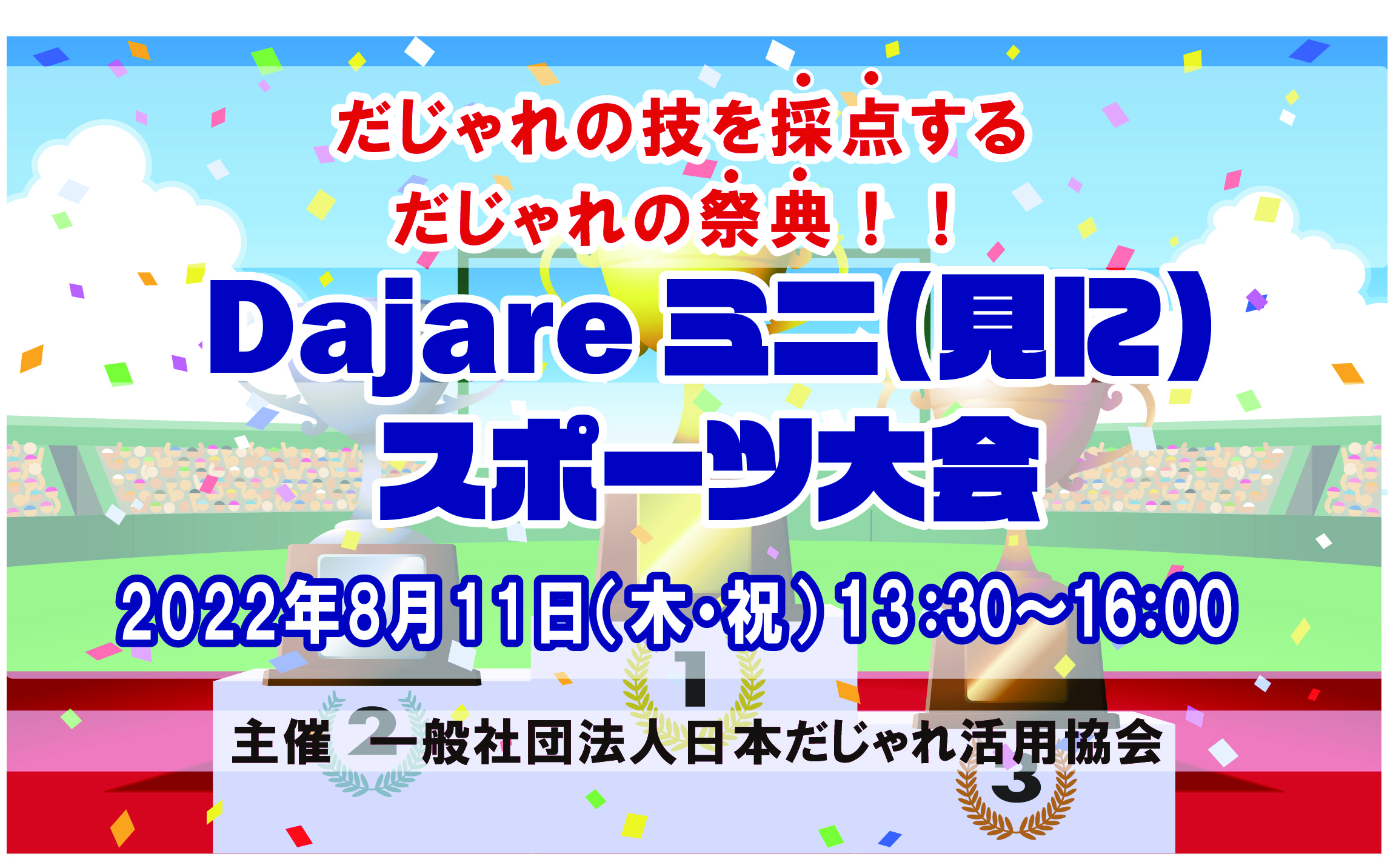 個人種目・チーム種目など、みんなでだじゃれを楽しんで盛り上がる3時間半!!! 豪華賞品をご用意しておりますので、「だじゃれを披露し、ヒーローになりたい方」はぜひお申し込み下さい!!! なお、観覧のみの場合は無料参加できますので、ご希望の方はお申込み下さい!| 開催日時 | 2022年8月11日(木) 13:30-16:00 |
